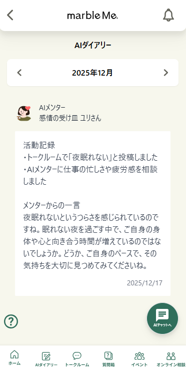 また、生成AIが1日1回、メンターとの対話やmarbleMeでの活動をもとにあなただけの非公開ダイアリーとして記録してくれます。 -