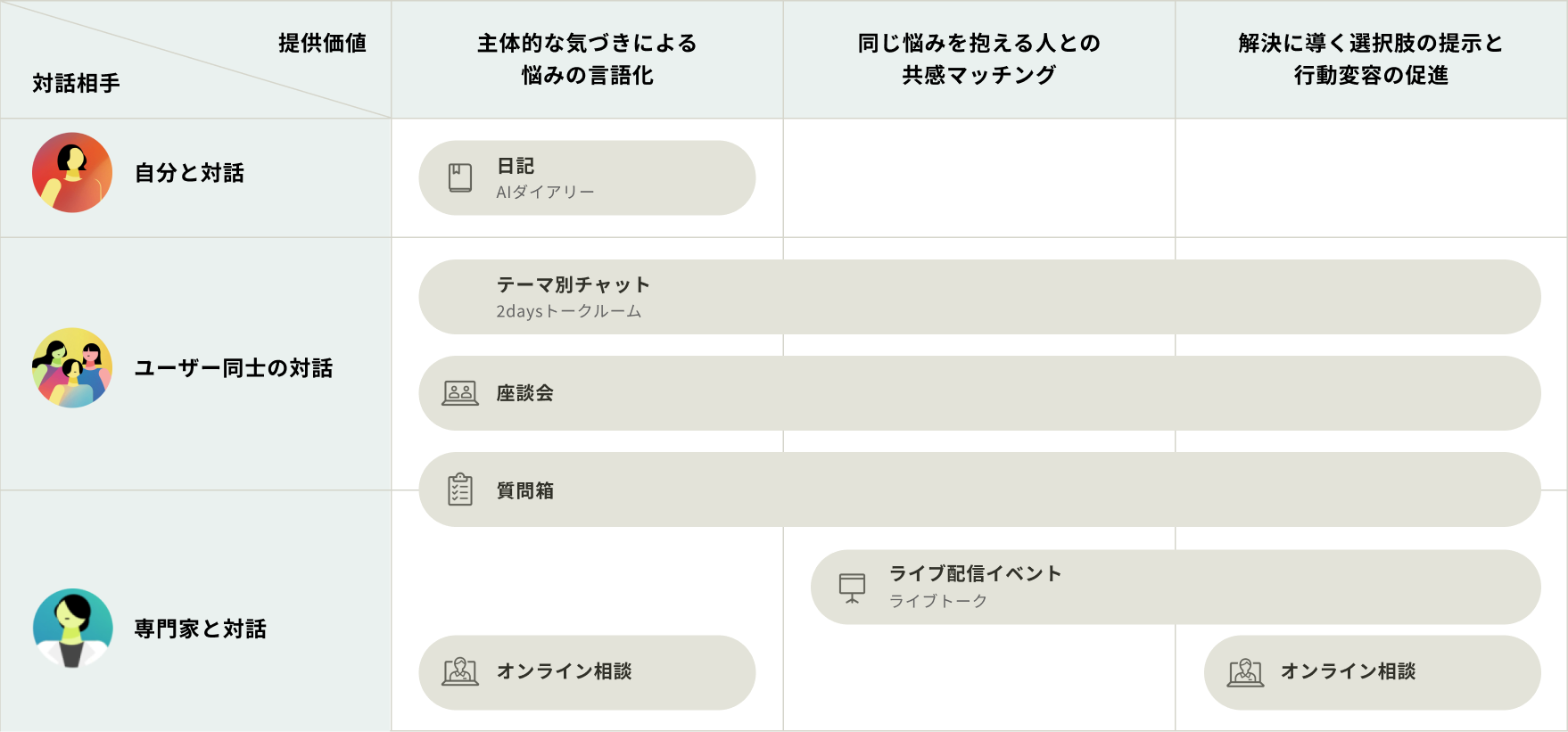 座談会では、参加ユーザー同士の対話を通じ、自身の悩みの言語化を支援します。互いの体験を共有することで、不安を和らげたり、新たな気づきを得るきっかけとなります。