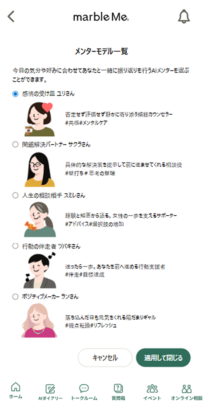 その日の気分やテーマに合わせてAIメンターを選びメンターとの対話を通じて日々の出来事や気持ちを整理することができます。